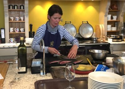 Les questions fusent, on rit, on apprend et on attend avec impatience de goûter tout ça. Le cours s’enchaîne : carpaccio de magret de canard, pana cotta au lait ribot et fruits rouges, dessert moelleux à la semoule et à la fraise. Nathalie se sent comme à la maison aux commandes de notre piano de cuisson Aga. « J’en ai un chez moi. C’était l’outil de cuisine de mes rêves. C’est un fourneau toujours très confortable pour cuisiner à la maison » confie-t-elle.