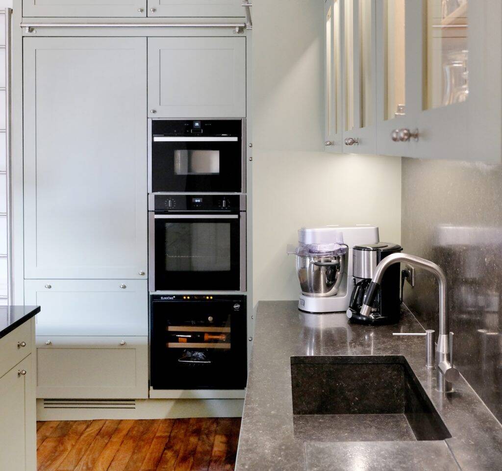 Cette solution allie élégance et fonctionnalité dans la cuisine. En jouant avec les contraintes de cet appartement au charme ancien, nous avons créé une cuisine dans laquelle chaque détail compte, transformant les faux niveaux en atouts décoratifs.