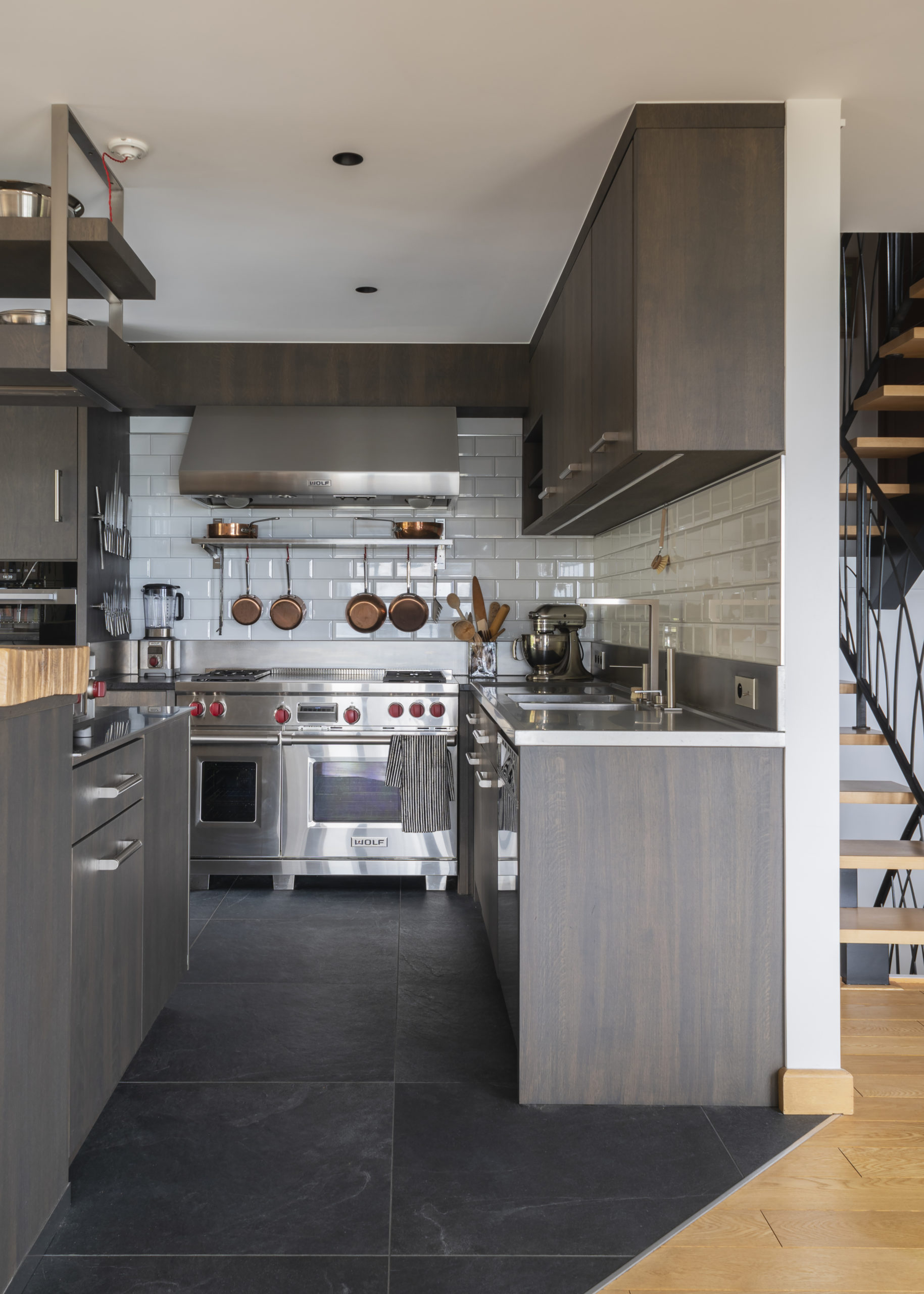 L’inox est également le matériau choisi pour les poignées de portes et le marche pied fixés au bar. Conçus pour réverbérer la lumière, les carreaux de métro contribuent davantage encore à conférer ce style brut au service de la cuisine avant tout.