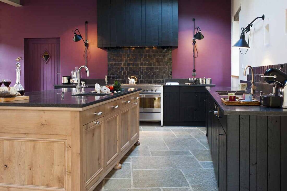 Voilà un subtil équilibre entre contemporain et respect des racines qui emprunte au style urbain et vintage et jouant de coloris audacieux : un laquage noir profond recouvre les façades des meubles le long des murs. Elles sont constituées de montants verticaux en chêne massif, de largeurs différentes et assemblés de façon irrégulière pour un aspect brut de sciage.