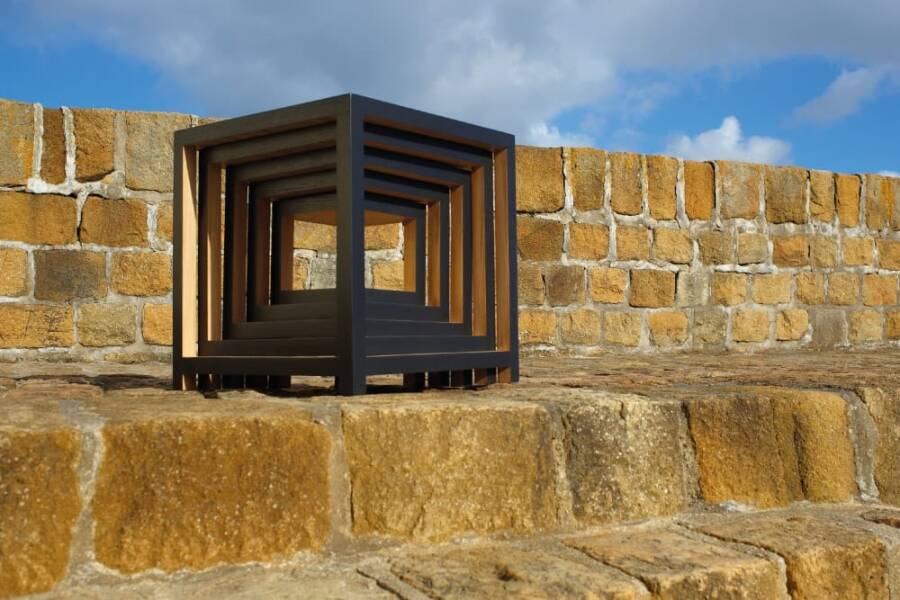Les contrastes entre les faces extérieures, laquées de noir, et les faces intérieures en chêne massif, accentuent le principe d’escalier généré par les différences de hauteur des traverses.