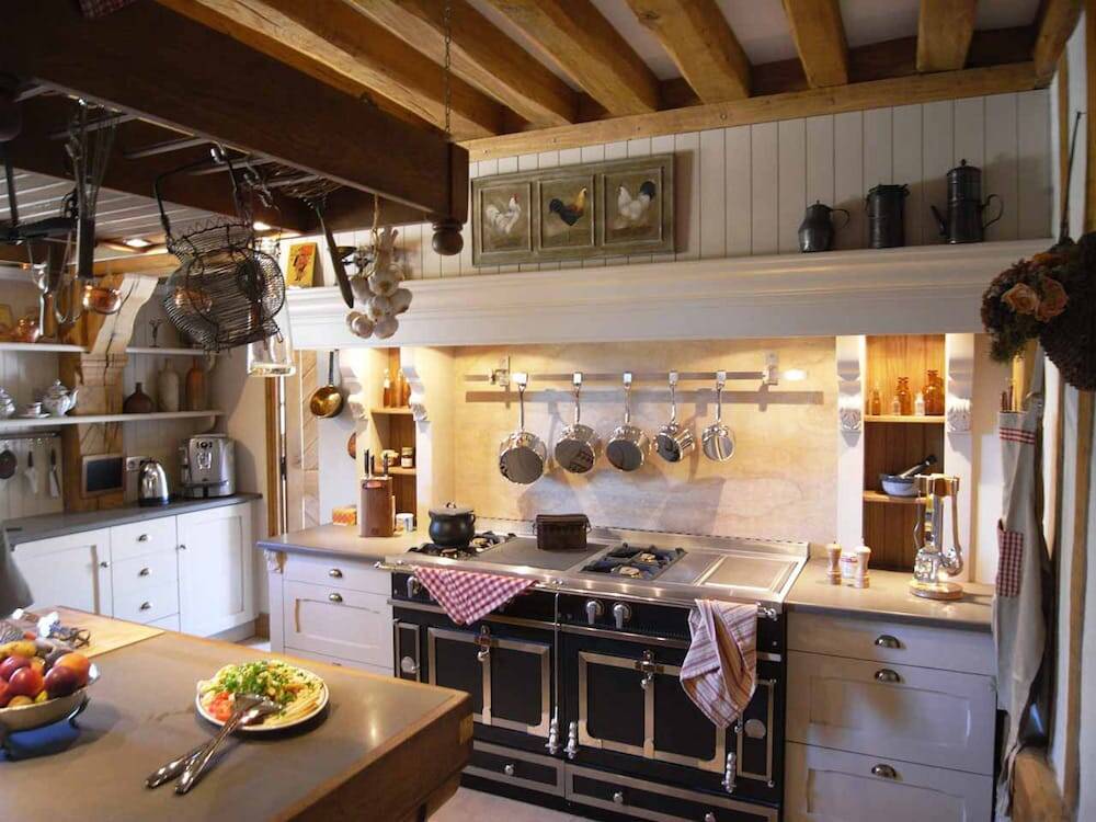 La décoration volontairement chargée renforce le côté authentique de la pièce. Les casseroles et poêles en cuivre accrochés sur le mur à colombage, le baldaquin équipé de quatre spots halogènes suspendu au-dessus de l’îlot central sous un plafond en poutres apparentes, les paniers en osiers expriment une référence et un attachement certain aux valeurs du passé.