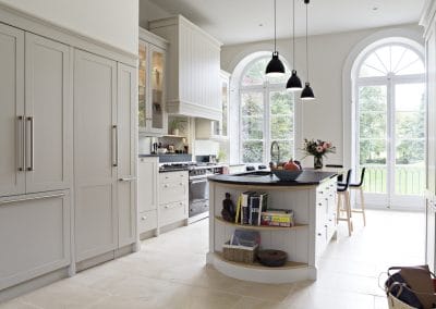 Nous avons voulu respecter le style classique de la maison avec une certaine sobriété dans les lignes. Toute la cuisine est déclinée dans une teinte « blanc mastic » unique conçue spécialement pour les clients en concordance avec l’univers de couleurs de toute la demeure.