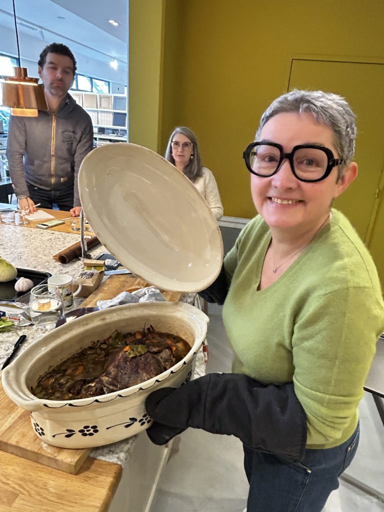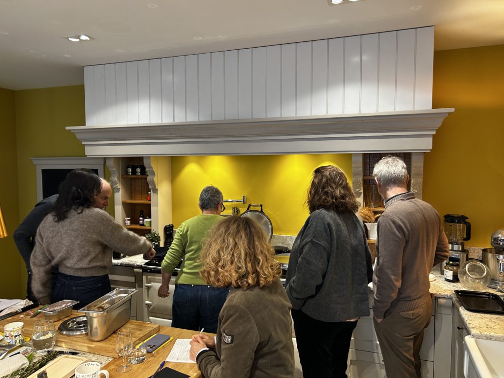 Dans un autre four, un gigot de 7 heures confit lentement depuis l’aube, dans une imposante cocotte à baeckeoffe alsacienne. Quand Cathy l’ouvre, les participants laissent échapper des « oh ! » admiratifs. Les questions fusent. Leur hôte répond tranquillement, coupe des panais, surveille les kakis rôtis, jette un coup d’oeil au moelleux au chocolat dans le four à pâtisser… et tout cela sans jamais regarder l’heure.