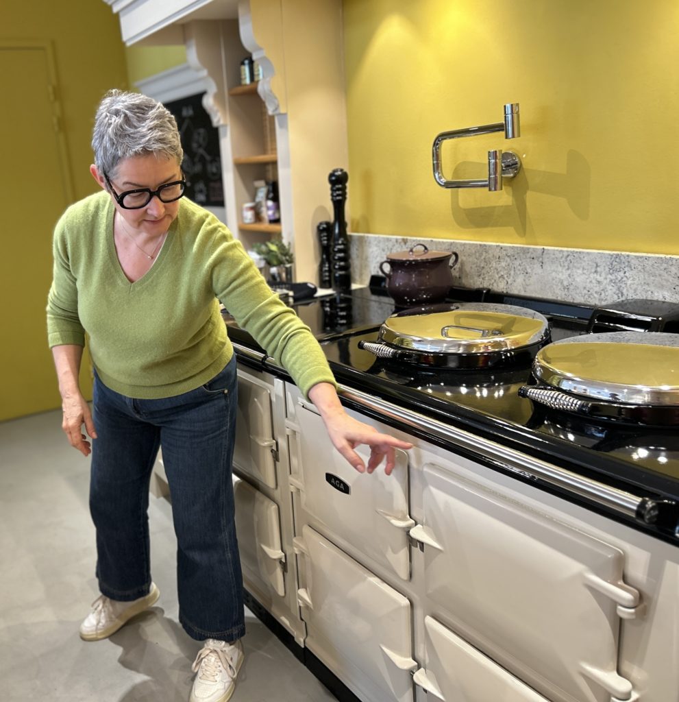 Dans la grande cuisine ouverte du showroom, le décor est posé : un grand îlot central, des tabourets confortables, une odeur de potimarron déjà dans l’air… et derrière Cathy, une imposante AGA R7, cinq fours, deux plaques et induction intégrée. La pièce maîtresse du jour.