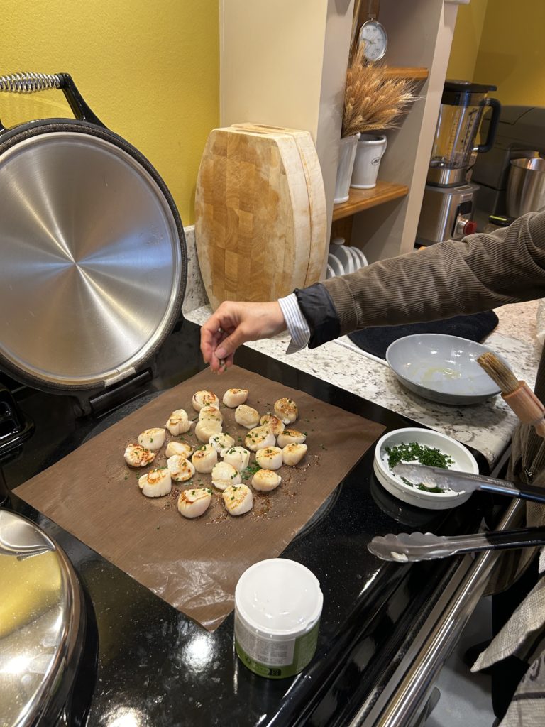 La scène se resserre autour du piano. Florence prend le relais sur la cuisson des coquilles Saint-Jacques et chacun observe, curieux, complice. La cuisson se fait sur une feuille de cuisson anti-adhésive et réutilisable. Pas de poêle. Pas de grésillement anxieux. Juste une chaleur constante et enveloppante.